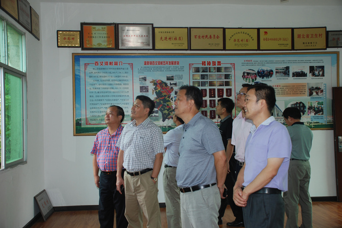 圖為英山縣溫泉鎮(zhèn)黨委書記段宇新(右一)向山河集團董事長程理財(左二)一行人員介紹百丈河村基本情況及榮譽