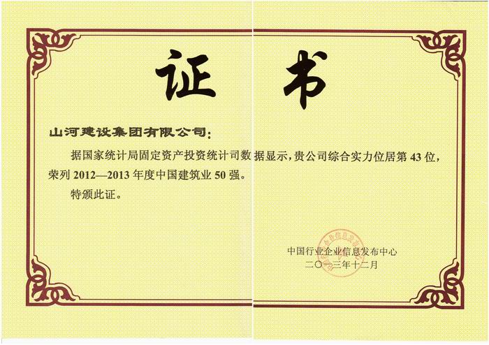 由國(guó)家統(tǒng)計(jì)局提供最新權(quán)威數(shù)據(jù)支持,中國(guó)行業(yè)企業(yè)信息發(fā)布中心主辦的“2013第十二屆中國(guó)建筑業(yè)50強(qiáng)測(cè)評(píng)成果發(fā)布暨頒獎(jiǎng)典禮”于2013年12月在京舉行。會(huì)上發(fā)布了中國(guó)建筑業(yè)50強(qiáng)名單,山河集團(tuán)位居第43名,提前兩年實(shí)現(xiàn)了山河集團(tuán) “二五”目標(biāo)中的該項(xiàng)指標(biāo)。