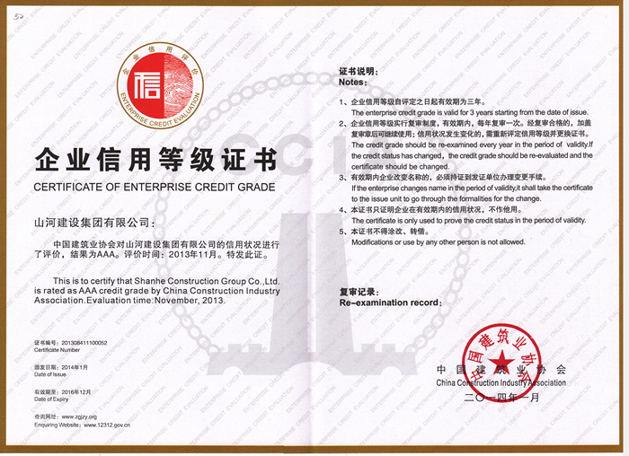 全國建筑業(yè)AAA級信用企業(yè)由中國建筑業(yè)協(xié)會頒發(fā),是建筑行業(yè)信用最高獎(jiǎng)項(xiàng)。此次評價(jià)嚴(yán)格按照《建筑業(yè)企業(yè)信用評價(jià)試行辦法》規(guī)定的程序進(jìn)行。經(jīng)企業(yè)自愿申報(bào)、各地區(qū)和有關(guān)行業(yè)、建筑業(yè)協(xié)會推薦、在建設(shè)系統(tǒng)相關(guān)網(wǎng)站上排查、專家評價(jià)組初評、全國建筑業(yè)企業(yè)信用評價(jià)工作指導(dǎo)委員會審定和網(wǎng)上公示。通過層層篩選,最終,包括山河建設(shè)集團(tuán)有限公司在內(nèi)的93家企業(yè)評定為2013年度全國建筑業(yè)AAA級信用企業(yè)。