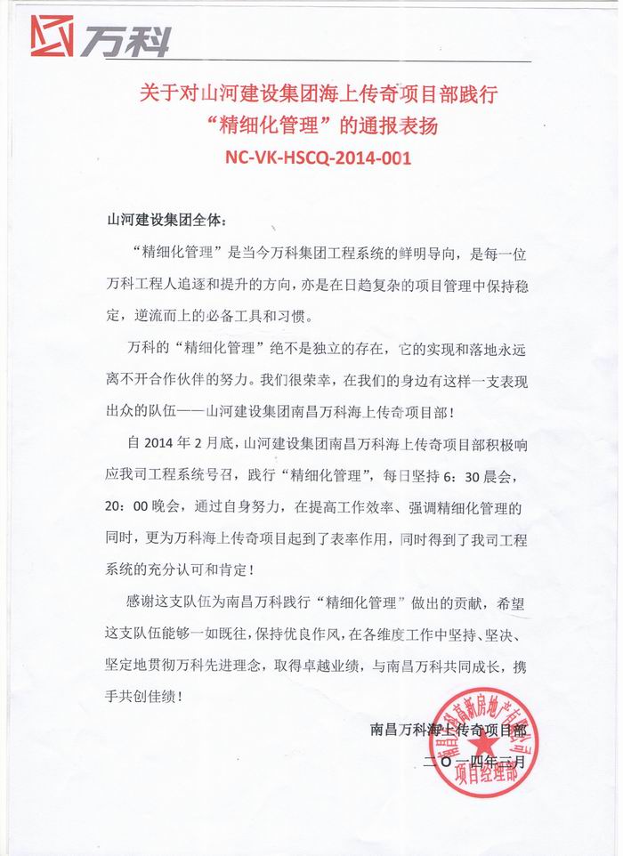 “感謝這支隊伍為南昌萬科踐行精細化管理做出的貢獻,希望這支隊伍與南昌萬科共同成長,攜手共創(chuàng)佳績!”近日,山河集團海上傳奇項目部收到了一封來自集團戰(zhàn)略合作伙伴――萬科地產的表揚信。