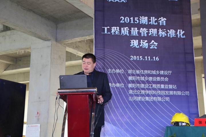11月16日上午,湖北省工程質(zhì)量管理標(biāo)準(zhǔn)化現(xiàn)場會在湖北文理學(xué)院科技園工研院項目召開。省質(zhì)安總站副站長董文斌,襄陽市建委副主任盧一平、質(zhì)檢站黨委書記倪海青、站長張林、副站長黃先明,湖北文理學(xué)院校黨委常委副校長魏躍春,湖北文理學(xué)院科技園發(fā)展有限公司副總經(jīng)理寇國良,山河集團(tuán)常務(wù)副總經(jīng)理兼湖北公司總經(jīng)理林中茂、湖北公司副總經(jīng)理羅定軍、詹必強等參加了會議。襄陽市工程質(zhì)量監(jiān)督檢查站站長張林主持會議。