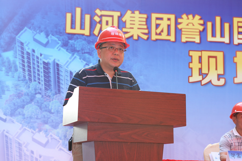 隨后,山河集團廣東公司總經理李新軍上臺致辭。他首先向出席現場會的區(qū)建設局領導、主管部門領導以及業(yè)界同仁表示衷心的感謝。在致辭中,李總強調,山河集團譽山國際項目成功召開現場觀摩會,得益于各級主管部門、各位領導對山河集團項目管理實踐工作的充分支持和信任。他表示,山河集團將強化安全生產基礎,大力實施綠色節(jié)能科技,為提升增城區(qū)建筑市場施工水平做出應有貢獻。