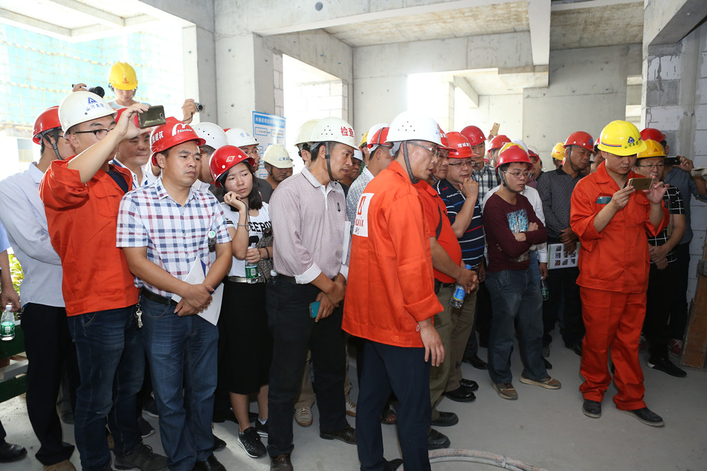 活動儀式結束后,參會領導和建筑業(yè)同行深入項目現場實地參觀。觀摩現場將建設過程各種工藝做成樣板間,向參觀者集中展示了山河集團在項目全過程中實施精細化、規(guī)范化、標準化管理的先進經驗和做法。其中,高大支模質量管控、內墻機噴砂漿系統等安全、節(jié)能、環(huán)保技術得到了參觀領導和同行人員的一致認可?!艾F場整潔、安全防護標準規(guī)范、定型化有利于周轉,不愧是增城區(qū)建筑同行的學習標桿”,來自增城中森地產公司的王經理觀摩后豎起大拇指。
