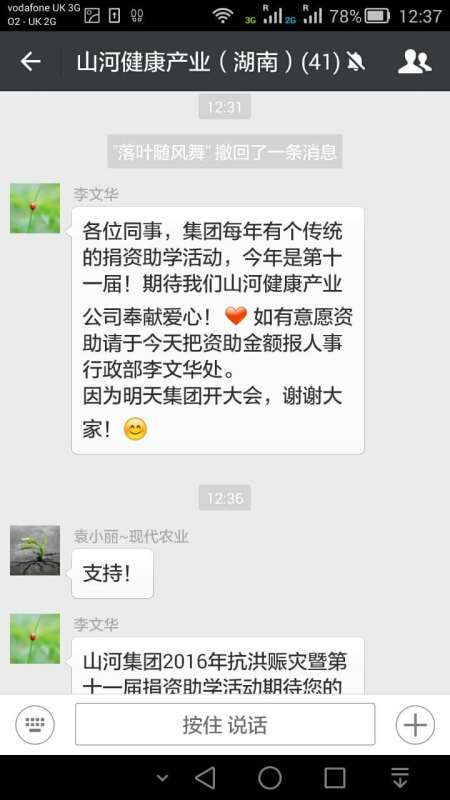 在我們得知有捐款這項(xiàng)活動(dòng)后,雖然已經(jīng)都下班了,但不到5分鐘時(shí)間,就在微信群里自發(fā)組織了公司員工捐款接龍活動(dòng);不到7分鐘就有一半員工即18名員工主動(dòng)報(bào)名捐款。