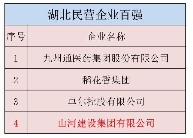 9月21日,由湖北省工商聯(lián)主辦的2016湖北民營(yíng)企業(yè)100強(qiáng)發(fā)布會(huì)在洪山賓館召開(kāi),山河集團(tuán)以304.85億元的營(yíng)業(yè)收入位居第四。