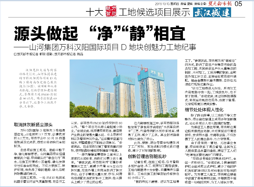 漢陽龍陽大道與陶家?guī)X路交匯處,山河集團(tuán)承建的萬科漢陽國際項目D地塊3棟超高住宅樓已巍然挺立。該項目部從源頭抓起,創(chuàng)新管理和建造模式,長期將工地PM10控制在80以內(nèi),噪音控制在60分貝以下,讓整個工地既干凈,又安靜。