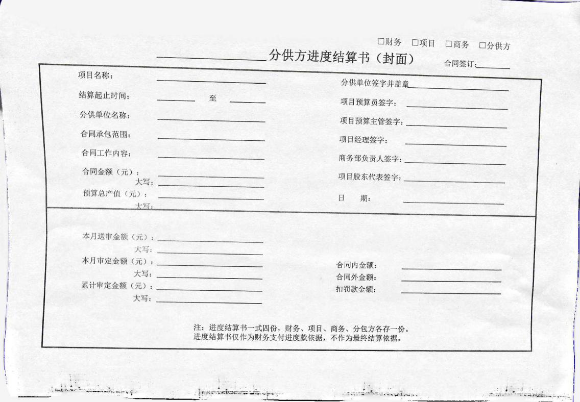 2、其次,項(xiàng)目商務(wù)部、材料部門每月20-25日根據(jù)本月現(xiàn)場完工進(jìn)度及材料收料清單,對已簽訂合同的各分供方辦理進(jìn)度結(jié)算,完成多少結(jié)算多少,項(xiàng)目經(jīng)理在結(jié)算書封面簽字確認(rèn)后,交財務(wù)及時入賬。