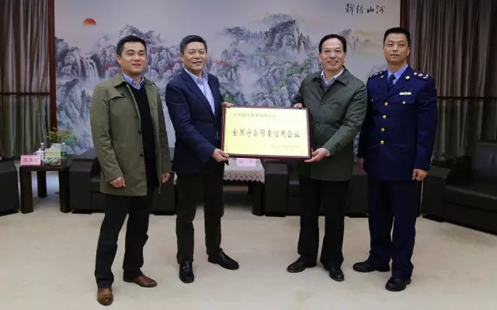 團(tuán)風(fēng)縣委常委、副縣長(zhǎng)涂軍(右二)向山河集團(tuán)董事長(zhǎng)程理財(cái)(左二)授牌