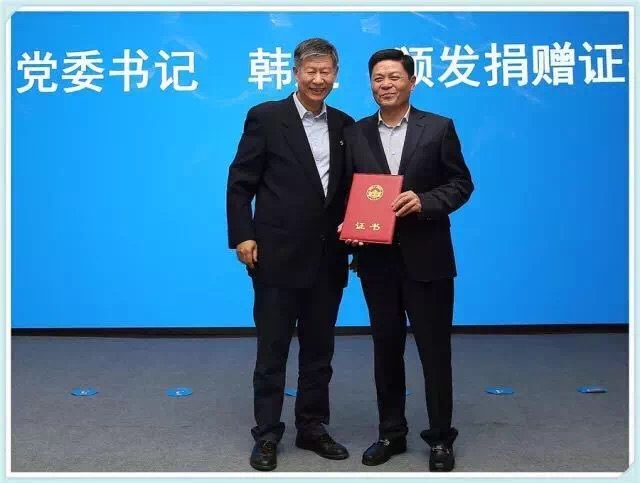 ▲武大黨委書(shū)記韓進(jìn)為董事長(zhǎng)程理財(cái)頒發(fā)捐贈(zèng)證書(shū)