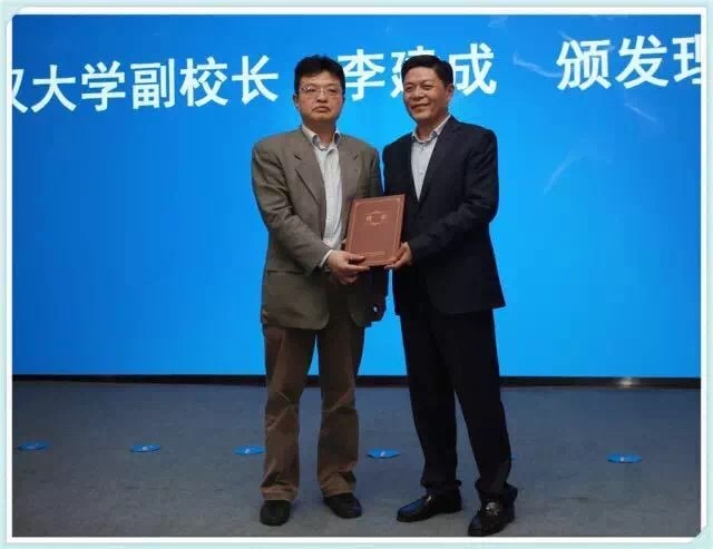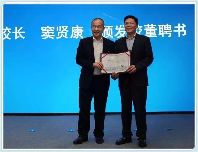 ▲武大校長(zhǎng)竇賢康向董事長(zhǎng)程理財(cái)頒發(fā)校董聘書(shū)