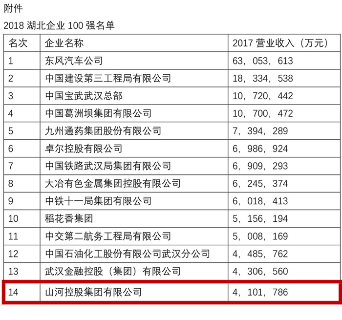 “荊楚百?gòu)?qiáng),再立潮頭。”7月20日,山河控股集團(tuán)以2017年度營(yíng)業(yè)收入410.1786億元的實(shí)績(jī)?cè)俅紊习?ldquo;2018湖北企業(yè)100強(qiáng)”,名列第14位,較去年第16位再次上升2個(gè)位次。當(dāng)天,湖北省企業(yè)聯(lián)合會(huì)、湖北省企業(yè)家協(xié)會(huì)公布了這個(gè)令山河人振奮的消息。