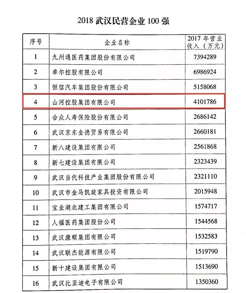 8月2日上午, 2018武漢百強(qiáng)民營(yíng)企業(yè)發(fā)布會(huì)在漢召開。榜單顯示,山河控股集團(tuán)在武漢民企百強(qiáng)中名列前茅, 位列第4位。