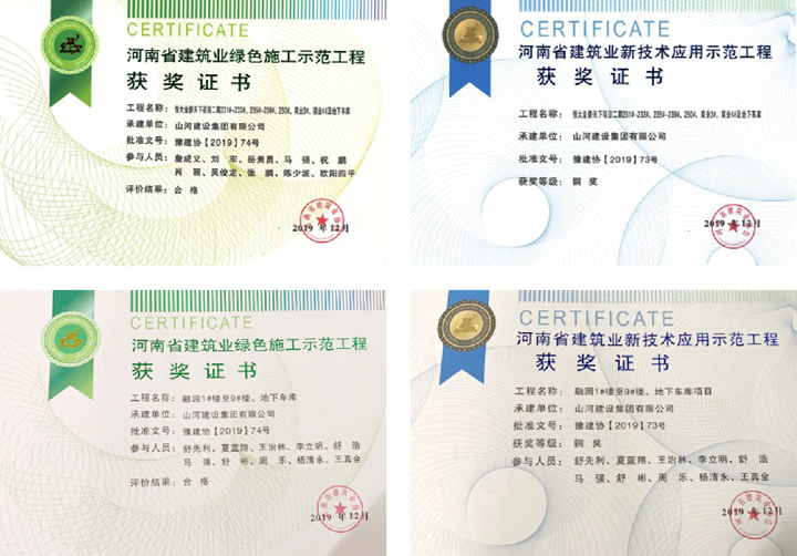公司承建的恒大金碧天下項目、融創(chuàng)融園項目分別榮獲河南省綠色施工示范工程、河南省新技術(shù)應(yīng)用銅獎各1項。這兩個項目在滿足立項要求后積極準備立項工作,施工過程中嚴格按照《河南省建筑業(yè)綠色施工示范工程管理辦法(試行)》《河南省建筑業(yè)新技術(shù)應(yīng)用示范工程管理辦法》的要求,堅持高標準建設(shè),確保高質(zhì)量完工,及時收集并準備評審資料,順利通過了評審。