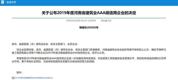 為進(jìn)一步加強(qiáng)建筑企業(yè)信用體系建設(shè),3月3日,河南省建筑業(yè)協(xié)會發(fā)布了《關(guān)于公布2019年度河南省建筑業(yè)AAA級信用企業(yè)的決定》,山河集團(tuán)河南公司榜上有名,這也是河南公司首次上榜。