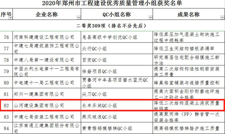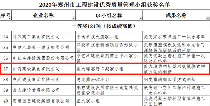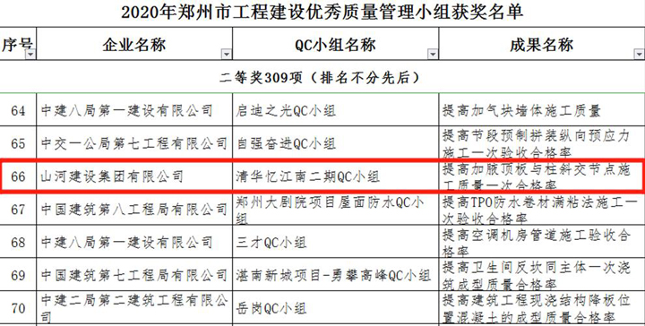 3月23日,鄭州市建筑業(yè)協(xié)會(huì)發(fā)布《關(guān)于表彰2020年鄭州市工程建設(shè)優(yōu)秀質(zhì)量管理小組活動(dòng)成果的通知》,山河建設(shè)集團(tuán)河南公司申報(bào)的三項(xiàng)成果榜上有名,恒大珺睿府二期QC小組獲得一等獎(jiǎng),清華憶江南二期QC小組、永豐樂城QC小組分別獲得二等獎(jiǎng)。