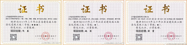 近日,山河建設集團江蘇公司三喜臨門,公司承建的2014-67號地塊(中駿柏景灣)、2012-59號地塊(中駿金水灣)、亞琦萬貿中心(二期)二標段三項工程榮獲“2019年江蘇省建筑施工標準化星級工地”稱號。