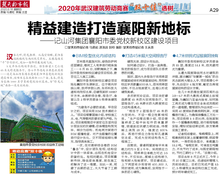 5大單體結構同步推進,借鑒橋梁工藝打造45米大跨度報告廳,潛心半年造起古典懸挑屋檐……這是由山河集團承建的襄陽市委黨校新校區(qū)建設項目,該項目總占地面積111.7畝,未來,將成為容納1000名學員的黨校培訓基地,為“臥龍之城”再添一座美麗地標。