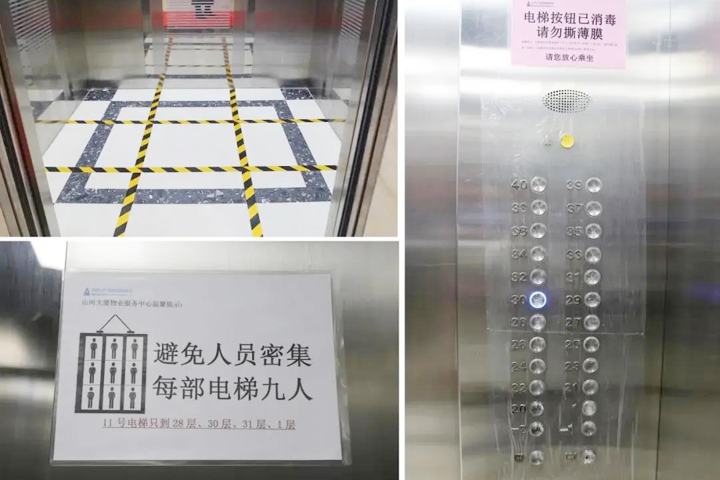 物業(yè)服務(wù)中心加強(qiáng)對進(jìn)出車輛的管控,大廈地庫通往寫字樓的進(jìn)出口暫時封閉,所有人員均須經(jīng)大堂出入,同時出入口分開設(shè)置。大廈一樓開辟了快遞外賣自提區(qū),減少人員近距離接觸,電梯實行“分區(qū)分層”管控,嚴(yán)格限制搭乘人數(shù),轎廂每小時固定消毒,規(guī)避潛在的交叉感染可能。