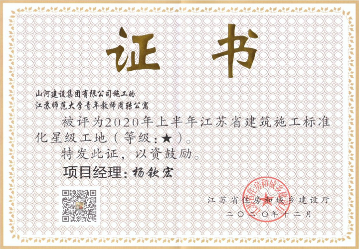 近日,從江蘇省住房和城鄉(xiāng)建設(shè)廳傳來(lái)喜訊,山河建設(shè)集團(tuán)江蘇公司承建的江蘇師范大學(xué)青年教師周轉(zhuǎn)公寓工程被評(píng)為“2020年上半年江蘇省建筑施工標(biāo)準(zhǔn)化星級(jí)工地”,再添一項(xiàng)省級(jí)榮譽(yù)。