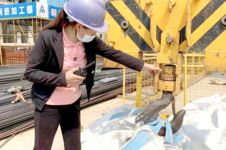 ▲居住項(xiàng)目(湖北交投產(chǎn)城華園二期)塔吊指揮員在吊裝前對(duì)起重設(shè)備吊具進(jìn)行自檢