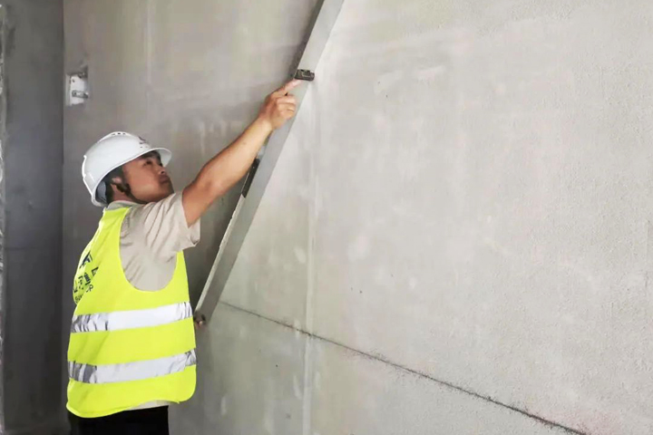 ▲新余聯(lián)發(fā)永康狀元府項(xiàng)目實(shí)測(cè)員在檢查墻面平整度