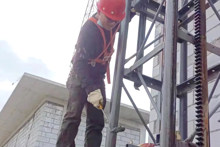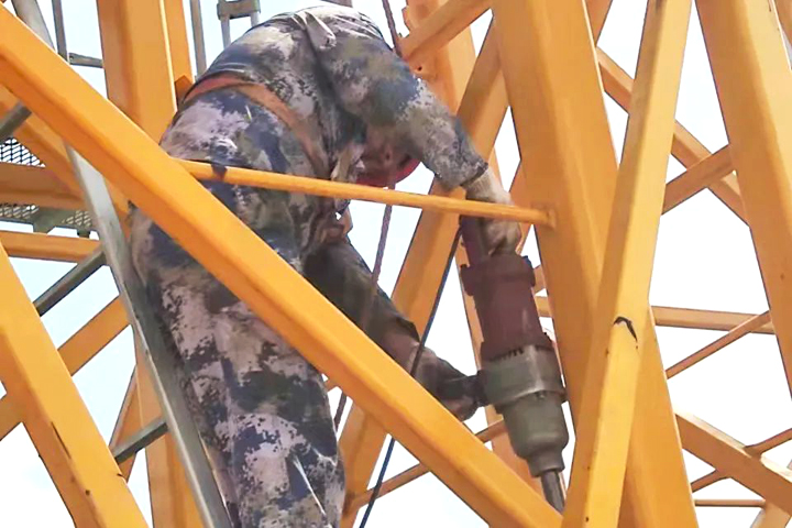 ▲定安牧嶼云天項(xiàng)目塔吊安拆工在做拆除塔吊前的準(zhǔn)備工作
