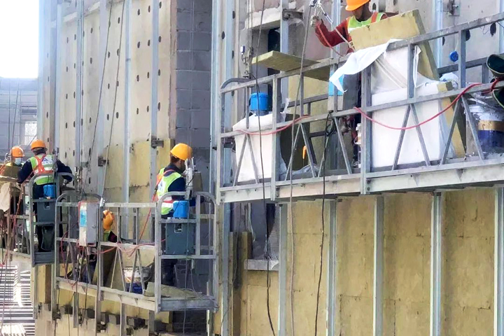 ▲天津華測(cè)儀器儀表制造項(xiàng)目工人在進(jìn)行外墻施工