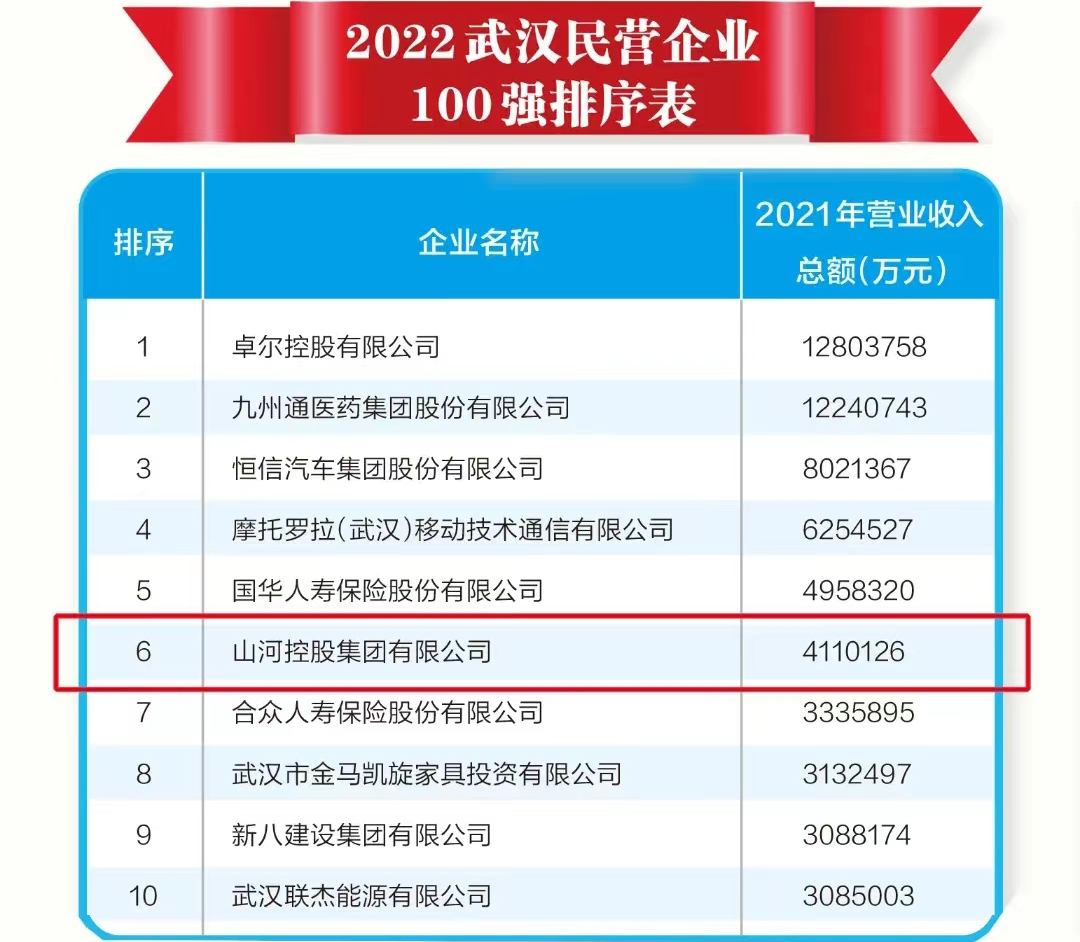 8月19日,2022武漢民營企業(yè)100強、民營制造業(yè)企業(yè)50強發(fā)布會暨金融服務民營企業(yè)高質量發(fā)展大會在武漢會議中心召開。大會發(fā)布的“2022武漢民營企業(yè)100強”榜單上,山河集團名列第6位。
