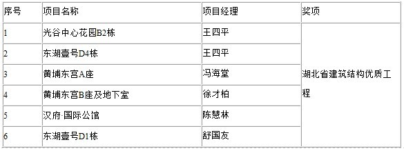 2008年4月9日,《湖北日?qǐng)?bào)》第六版專版刊登《湖北省建設(shè)工程質(zhì)量安全協(xié)會(huì)公告》。根據(jù)《湖北省建筑結(jié)構(gòu)優(yōu)質(zhì)工程評(píng)審辦法》,湖北省建設(shè)工程質(zhì)量安全協(xié)會(huì)組織開展了2007年度省建筑結(jié)構(gòu)優(yōu)質(zhì)工程評(píng)選活動(dòng),經(jīng)對(duì)申報(bào)工程初審、核查和省建筑優(yōu)質(zhì)工程評(píng)審,全省有323項(xiàng)工程榮獲2007年度湖北省建筑結(jié)構(gòu)優(yōu)質(zhì)工程獎(jiǎng),其中,山河集團(tuán)有光谷中心花園、東湖壹號(hào)、黃埔東宮、漢府?國際公館等6項(xiàng)工程獲此獎(jiǎng)項(xiàng)。具體如下表: