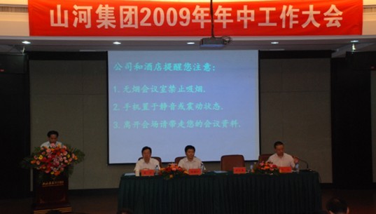 2009年9月19日-20日,山河集團(tuán)2009年年中大會在江西廬山西海度假村會議中心召開。集團(tuán)公司董事長程理財、黨委書記舒先厚、總經(jīng)理黃林以及各黨委副書記、副總經(jīng)理、三總師和集團(tuán)公司辦公人員、區(qū)域公司及子公司主要負(fù)責(zé)人、集團(tuán)公司項(xiàng)目經(jīng)理近兩百人齊聚一堂,共商山河發(fā)展大計。